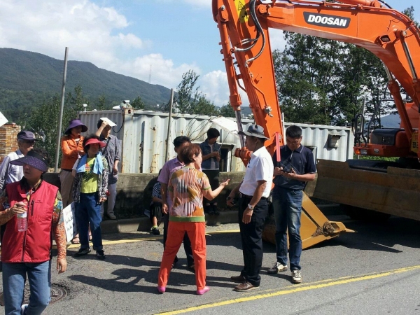 ▲ 고물상 건축을 반대하는 주민들이 공사장 입구에서 건설장비 출입을 막고있다. |