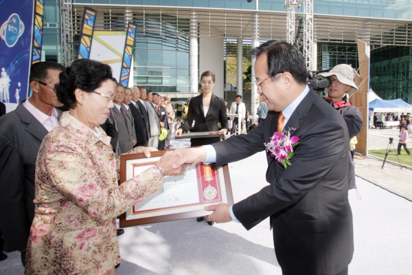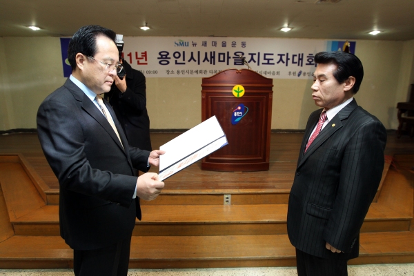 지난 21일 시청 에이스 홀에서 진행된 용인시 노인의 날 기념식 행사 중 김학규 용인시장 상 시상 직전 사회자의 안내 방송내용이다.