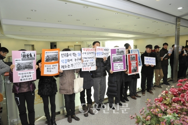 ▲ 축구센터 소속 선수들의 학부모들이 센터 경영진의 일방적인 감독 해임 등에 항의하며 행정사무감사 중인 시의회에서 시위하고 있는 모습. |