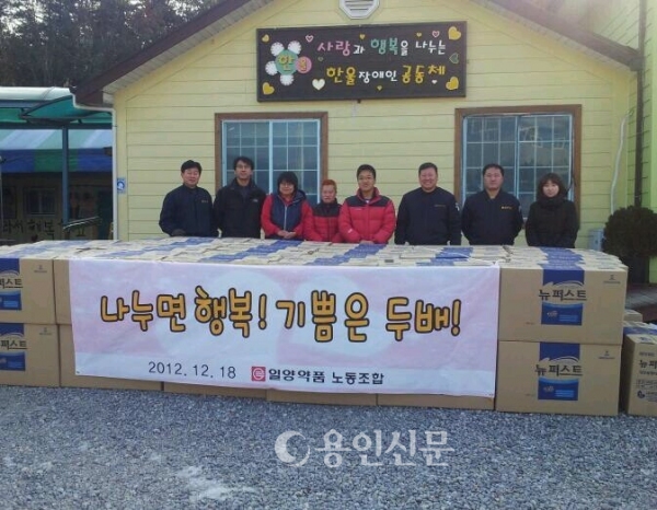 처인구 백암면에 위치한 일양약품㈜ 노조는 지난 18일 처인구 양지면 주북리에 있는 ‘한울자체장애인공동체’를 방문해 시가 500여만원 상당의 성인용 팬티형 기저귀를 전달하고 복지시설 원생들을 위로했다.