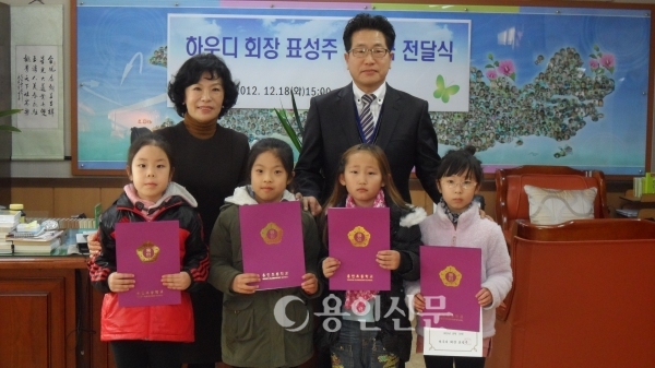 이날 ‘하우디’는 용인초교의 추천을 받은 어린이 4명에게 120만원의 장학금과 쌀을 증정했다.