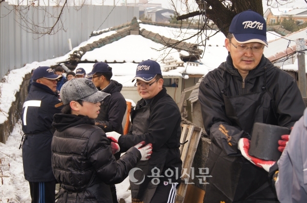 오랜만에 풀린 날씨 속에 옷가지와 얼굴에 위장크림 대신 연탄가루를 묻히며 연신 옆사람에게 연탄을 전달하는 준사관단과 가족들. 이들의 따뜻한 사랑나눔으로 이날 용인시 사랑의 온도계는 1℃ 상승했다.