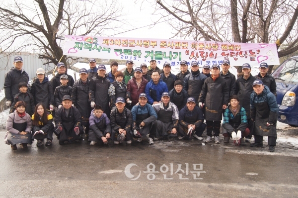올겨울 들어 이어지던 폭설과 한파 주위보가 해제된 지난 12일 처인구 모현면 매산리 주택가 골목. 한눈에 봐도 ‘군인’으로 보이는 사람들과 자녀들로 보이는 어린 학생 30여명이 한 줄로 늘어서서 일사분란하게 연탄을 전달한다. 날씨가 풀렸다곤 하지만 여전히 추운날씨임에도 연탄재가 묻은 얼굴들에는 웃음이 넘쳐난다.