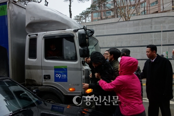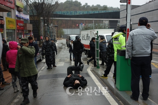 지난 23일 기흥구 공세동에 위치한 한 아파트 입구. 이날 이곳에서는 아파트 입주를 위해 들어가려는 분양권자와 이를 막는 용역업체 간의 몸싸움이 이어졌다.