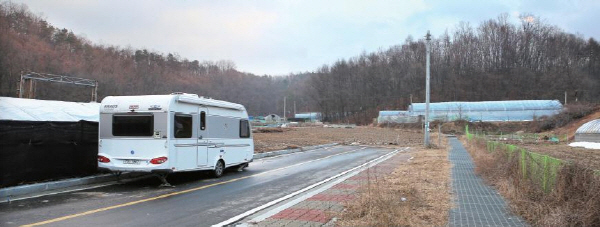 ▲ 도로개설 목적인 보라근린공원 조성사업이 계획조차 제대로 마련되지 않았음에도 지난 2011년 완공된 기흥 2-129호 도로. 특정 시의원의 압력으로 개설된 것으로 알려진 이 도로 끝에 세워진 ‘공원진입로’라는 안내 표지판만이, 이 막다른 도로의 개설 목적을 알려주고 있다. |