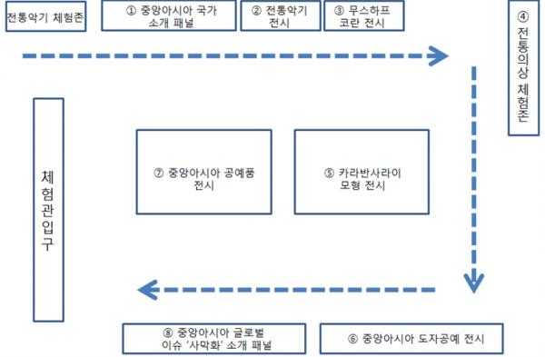 참여 공간에는 중앙아시아의 스위스라 불리는 ‘키르기즈공화국’, 유라시아의 중앙관문인 ‘우즈베키스탄’, 불의 나라 ‘아제르바이잔’ 등의 국가 전통의상, 공예품, 생활용품, 서적, 악기, 유적 모형의 다양한 물품을 관람하고 체험할 수 있다.
