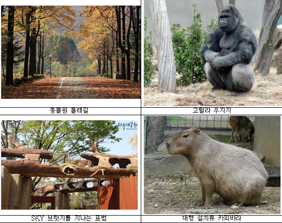 서울대공원 동물원에는 국내 최대 규모인 310종 3,600여 마리의 동물들뿐만 아니라 정문에 들어서서 동물원을 한 바퀴 도는 동안 청계산으로 둘러싸인 자연환경과 동물 이야기가 어우러진 특별한 힐링 장소들도 만날 수 있다.