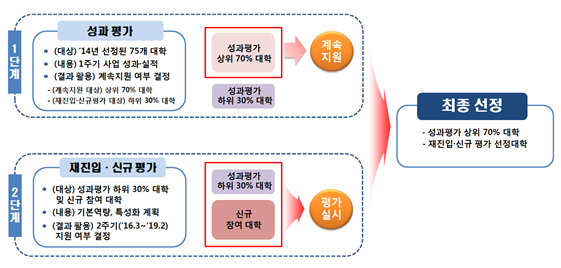 성과평가에서는 기존 사업 수행 대학을 대상으로 계속지원 대상 대학(상위 70%) 및 재진입.신규평가 대상 대학(하위 30%)을 선별하며, 재진입.신규평가에서는 성과평과 하위 30% 대학과 신규진입 대학 간 비교평가를 통해 사업 수행 대학을 최종 확정하게 된다.