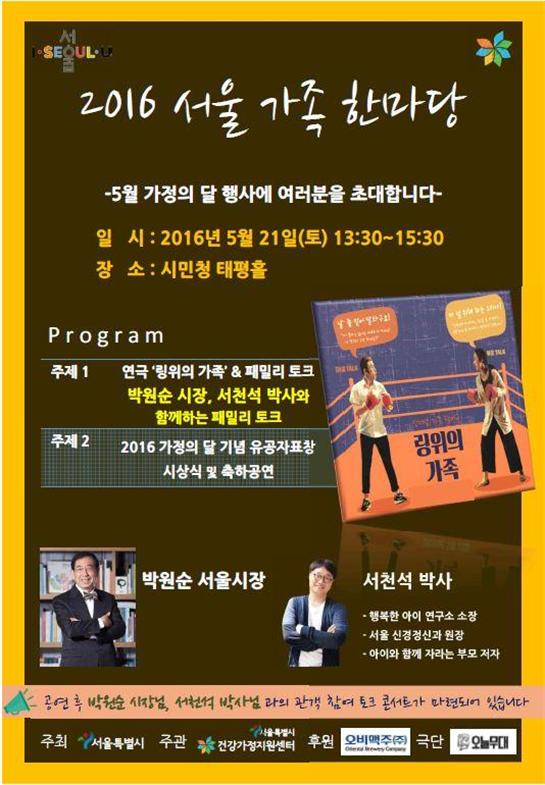 [용인신문]서울시는 5월 가정의 달을 맞이하여 오는 5월 21일 시민청 태평홀에서 온 가족이 참여할 수 있는 ‘2016 서울 가족한마당’을 개최한다고 밝혔다.