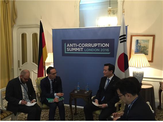 ▲ 김현웅 법무부장관이 2016. 5. 12.(목)(현지시각) 영국 런던 소재 랭카스터 하우스(영국 외교부 국제회의장)에서 개최된 「반부패 頂上회의」에 대한민국 정부대표로 참석하여 마스 독일 법무부장관과 양자회담을 하고있다. |