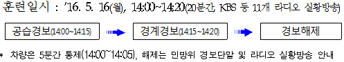 또한 훈련시간 20분 동안은 전국 라디오방송을 통해 국가 안보태세와 훈련의 중요성 및 비상시 국민행동요령에 대한 내용으로 방송될 예정이다.