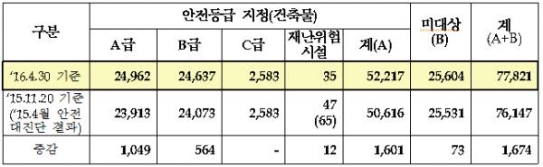 그동안 지속적인 안전점검 및 보수.보강을 실시한 결과 건물상태 등급은 A.B등급 건물이 증가(‘15.11월 47,986동 → ’16.4월 49,599동)하는 등 전반적으로 안전성이 향상된 것으로 나타났다.
