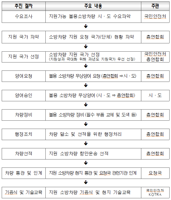 | ▲ 내용연수 경과 소방차량 무상지원사업 추진절차 | ||