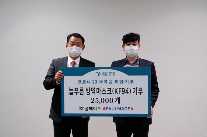 [용인신문] 용인대학교(총장 박선경)는 지난 12일 마스크 생산 업체인 (주)폴메이드(대표 이원일)로부터 ‘늘푸른마스크 KF94’ 2만5000장을 기부받았다.