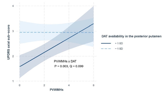 도파민 결핍 정도가 심하지 않은 파킨슨병 환자에서 보행장애에 대한 백질변성의 영향력이 훨씬 큰 것으로 나타났다