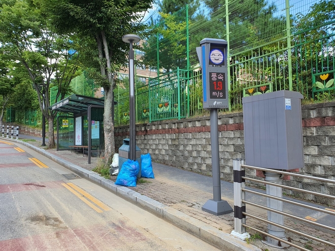 대청초등학교 버스정류장 앞에 설치된 미세먼지 알림 신호등