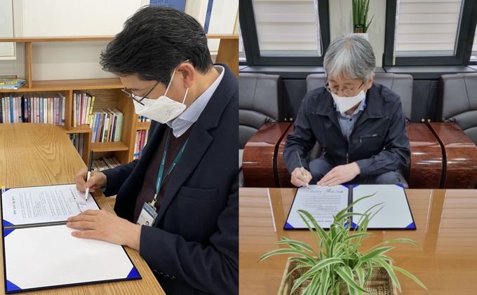 협약서에 서명하는 한근식 관장(좌)과 정석규 지사장