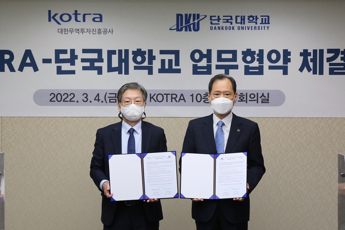 김수복 단국대 총장(오른쪽)과 유정열 KOTRA 사장이 바이오헬스 분야 외국인투자기업인력양성을 위한 업무협약을 체결했다.