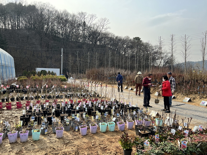 나무시장을 찾은 손님들이 나무를 고르며 환담하고 있다.