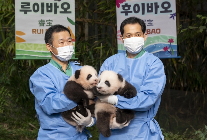 아기 판다들의 이름은 지난 8월 24일부터 10월 6일까지 40여 일간 진행된 대국민 이름 공모 이벤트를 통해 선정됐다. 에버랜드 SNS 채널과 동물원 팬 카페 등에서 진행된 댓글 공모에는 약 2만 명이 참여해 4만여 개의 이름이 응모됐고, 20여 만 명이 참여한 1차 온라인 투표와 50만 명이 참여한 결선 투표 결과 루이바오와 후이바오로 선정됐다.