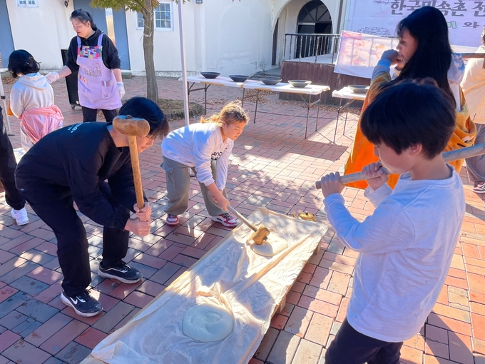 인절미 만들기 떡메체기를 체험하는 참가 청소년들 모습