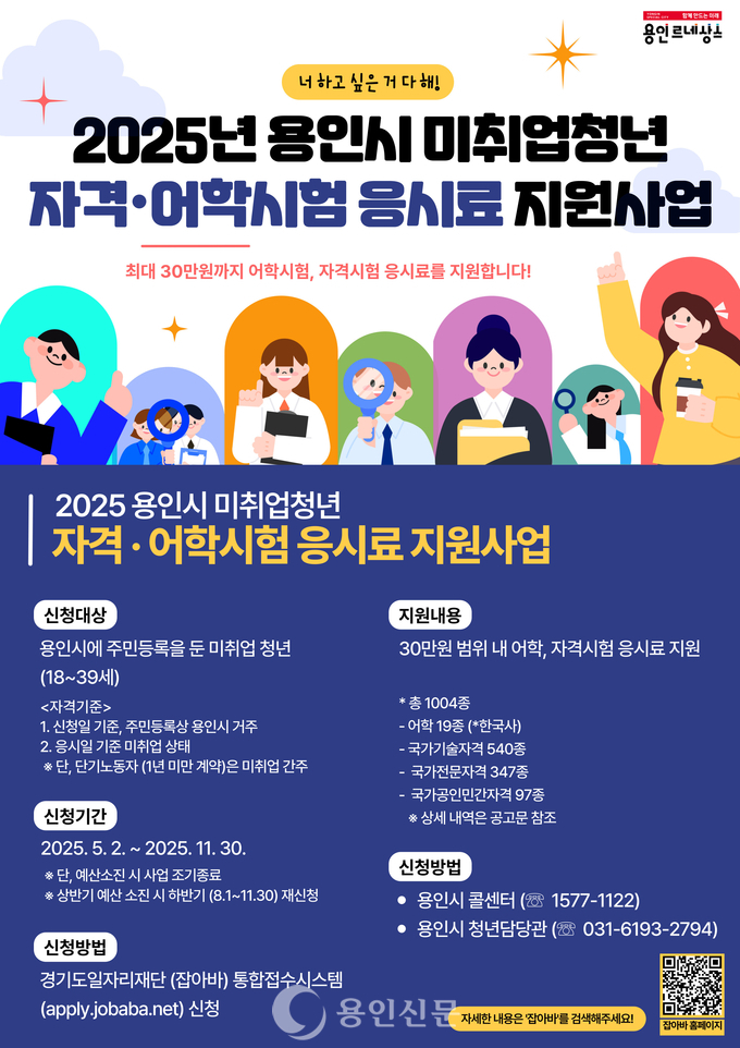 대상은 용인시에 거주하는 18~39세 청년(1985년생~2007년생)이며, 응시 횟수 제한 없이 1인당 30만원까지 응시료 실비를 지원한다. 시는 취업 준비 청년들의 경제적 부담을 덜고 취업 역량을 키울 수 있도록 지난해에 이어 올해는 지원 과목을 늘려 사업을 추진 중이다.