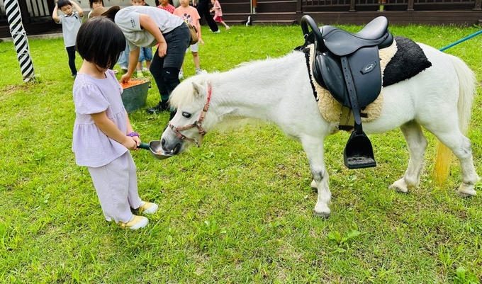 체험은 유치원 내 공간인 초롱뜰과 놀이터에 작은말들을 준비하고 아이들이 안전하게 말과 가까이 만나볼 수 있도록 했다.
