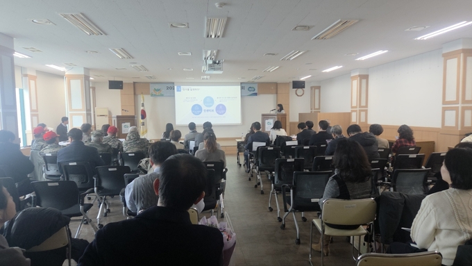 김현희 마북동주민자치위 사무국장이 경기도 수자원본부에서 우수사례 발표하고 있다
