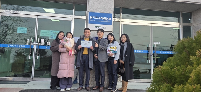 경기도수자원본부 현관에서 좌로부터 공지현 주민자치위원, 홍인영 주민자치 담당 주무관, 이종현 위원장, 이원경 동장, 김현희 주민자치사무국장, 박주영 주민자치위원이 표창 기념 사진을 촬영했다