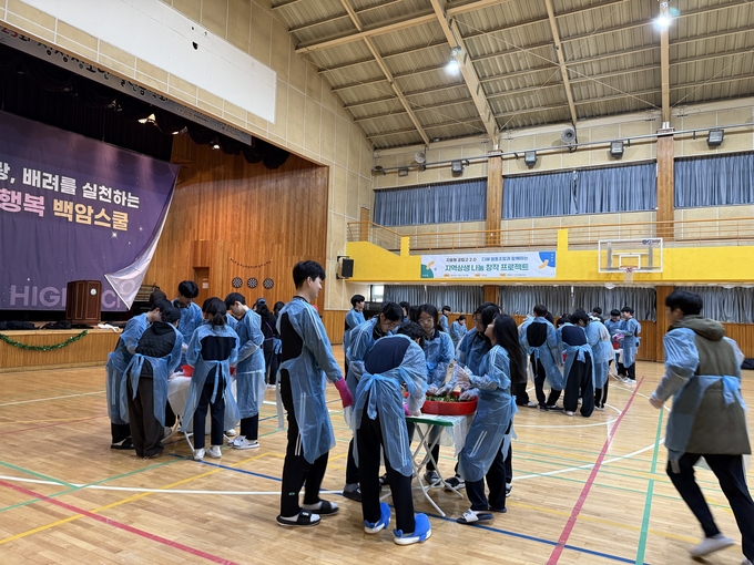 백암고등학교 학생들이 지역기업과 손잡고 학교 강당에서 김장담그기 체험을 하고 있다 이날 담근 김치는 이웃과 복지시설에 전달하는 등 상생의 모범이 됐다