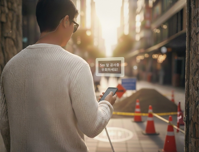 스마트폰 앱을 활용해 도로 정보를 확인하는 시각장애인
