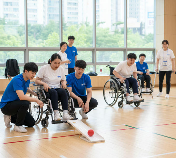 장애인과 비장애인이 함께 보치아 게임을 연습 하고 있다