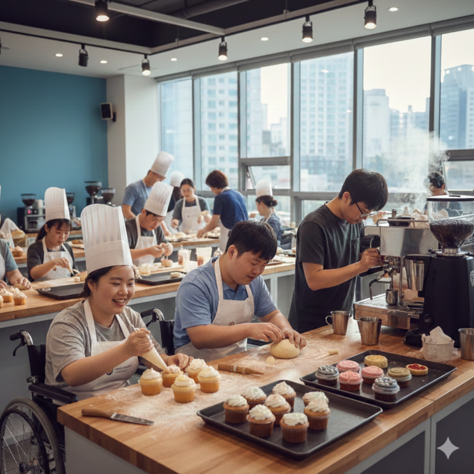 전환기 센터에서 직업 훈련을 받는 발달장애인들의 활기찬 모습