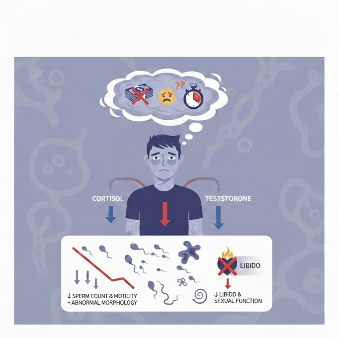 여기에 정자 건강을 위협하는 악재가 있다. 업무 스트레스는 물론이고, 만약 매일 돈에 대한 압박과 걱정을 하고 있다면 더 안 좋아진다. 특히 금전 문제로 인한 스트레스가 만성화되면 코르티솔이라는 호르몬이 높아지는데, 이 호르몬은 테스토스테론 분비를 억제한다. 테스토스테론은 남성다움의 상징이 아니라, 정자 생산과 성기능을 떠받치는 핵심 축이다. 코르티솔이 올라가고 테스토스테론이 눌리면 정자 수는 줄고, 운동성은 떨어지며, 형태도 흐트러진다. 동시에 성욕, 즉 리비도와 성적 반응성도 함께 낮아진다. 피곤해서 그렇다고 넘기기엔, 몸 안에서는 이미 호르몬 지형 자체가 바뀌고 있는 셈이다.