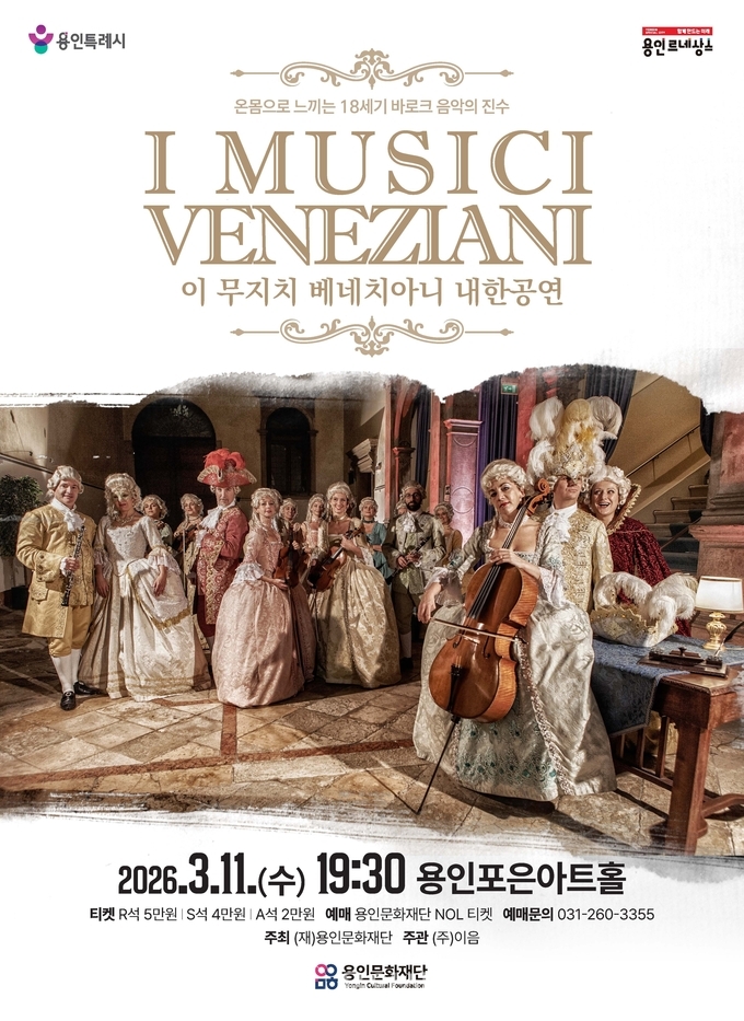 이번 공연에서는 바로크 시대의 가장 아름다운 오페라 아리아로 구성된 프로그램을 선보일 예정이다. 베네치아의 살아있는 문화유산으로 불리는 ‘이 무지치 베네치아니’는 음악적 완성도뿐 아니라 시각적 연출에서도 높은 평가를 받고 있으며, 18세기 바로크 시대의 복식과 장신구를 재현한 무대를 통해 한 편의 오페라 극장을 옮겨온 듯한 몰입감을 선사할 것으로 기대된다. 문의는 용인문화재단 CS센터 (031-260-3355, 3358).