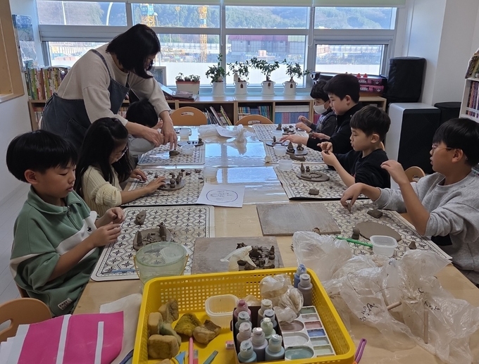 용인시의 한 다함께 돌봄센터에서 아이들이 도예 전문가의 지도 아래 찰흙을 빚으며 창의 예술 체험 활동에 몰입하고 있다. 용인시는 올해 시설 확충을 넘어 이처럼 수준 높은 학교 밖 커리큘럼을 강화해 돌봄의 질적 성장을 도모한다