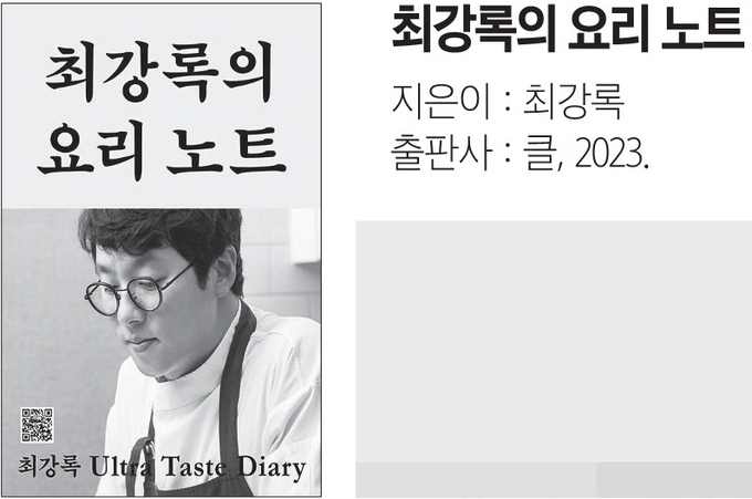 용인신문 | 〈흑백요리사 2〉와 〈마스터셰프 코리아 2〉 우승자, 〈냉장고를 부탁해〉에 등장해 극 내향형 인간의 진수를 보여준 요리사, 조림핑. 최강록을 가리키는 말은 여럿 있으나 작가 최강록이라는 타이틀을 하나 더해야 옳을 듯하다. 2014년부터 꾸준히 출간을 이어온 최강록의 도서를을 보면 개인의 요리 레시피 뿐 아니라 번역과 감수를 맡아 하기도 하고, 에세이 집도 보이기 때문이다. 비교적 최근작인 『최강록의 요리 노트』는 보통사람들이 일상으로 하는 식생활과 가까운 요리가 소개되어 반가운 책이다.
