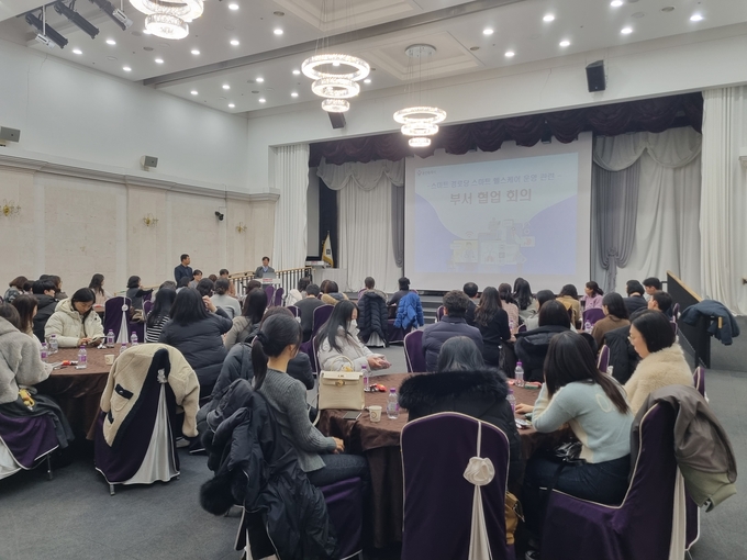 용인시청 컨벤션홀에서 열린 스마트 경로당 헬스케어시스템 운영 관련 부서 협업 회의 전경. 3개 구 보건소와 36개 읍면동 맞춤형복지팀 관계자 70여 명이 한자리에 모여 스마트 기기로 수집된 어르신 건강 데이터를 실제 복지 서비스로 연결하기 위한 구체적인 실행 방안을 논의하고 있다