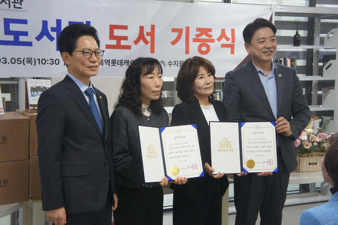 (왼쪽부터) 황정근 국회도서관장, 강하영 동천도서관장, 이금숙 수지꿈꾸는도서관장, 부승찬 국회의원이 기증서 전달식을 마친 후 기념 포즈를 취하고 있다. 이날 국회도서관은 두 도서관에 각각 350권씩, 총 700권의 도서를 기증했다