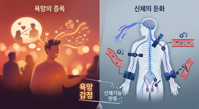 알코올은 뇌의 억제 회로를 먼저 무너뜨린다. 그래서 욕망은 커진다. 하지만 동시에 신경 전달은 느려지고, 혈관 반응은 둔해진다. 발기는 단순한 의지가 아니라 신경과 혈관이 정교하게 맞물린 결과다. 뇌에서 시작된 신호가 척수를 지나 말초로 전달되고, 혈관이 확장되며 혈류가 채워져야 비로소 완성된다. 술은 이 모든 과정에 동시에 개입한다. 욕망은 올려놓고, 기능은 끊어버린다.