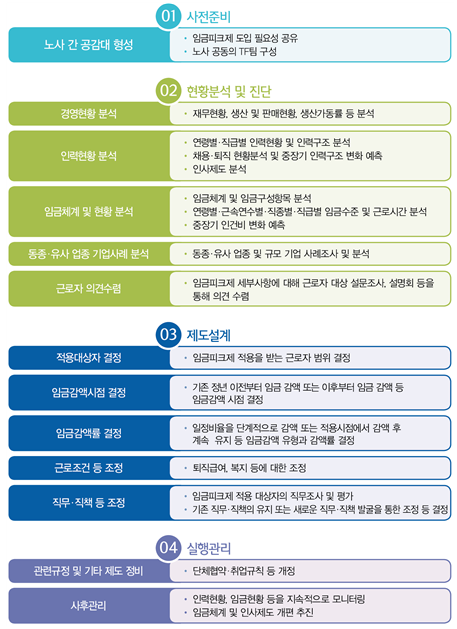 이와 함께, 실제 기업들이 임금피크제 도입과정에서 활용할 수 있도록 단계별 절차와 체크포인트, 선도적으로 임금피크제를 도입한 기업 사례와 정부지원제도(임금피크제 지원금)에 대한 내용도 수록했다.