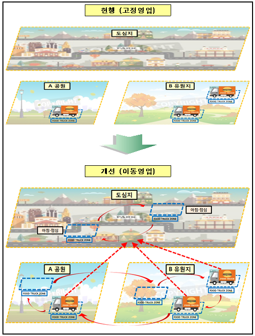지금까지 공유지 사용은 한 사람에게 한 장소에 대해서 장기간(통상 1~5년) 사용을 허가해 주는 것이 원칙이었다. 따라서 푸드트럭 영업자 한 사람이 이동영업을 하기 위해서는 여러 장소를 사용 허가해 주고 사용료는 전체 장소에 대해 연 단위로 부과하여야 했다. 이럴 경우 한 사람에게 너무 많은 혜택과 사용료 부담이 돌아가게 된다.