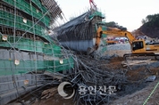 지난 달 25일 9명의 사상자를 낸 처인구 남사면 국지도 공사현장 교량 상판 붕괴사고 원인은 설계도를 따르지 않은 부실시공인 것으로 조사돼 공사책임자 7명이 형사입건됐다. 특히 시공과정에서 단계별로 콘크리트를 타설해야 함에도 불구하고 옹벽과 상판을 동시에 타설한 탓에 상판을 지지하는 기둥(동바리)이 과도한 하중을 이기지 못해 붕괴된 것으로 밝혀졌다. 용인동부경찰서 수사전담반은 지난 2일 업무상 과실치사상 혐의로 발주처인 한국토지주택공사 백아무개(52) 감독소장과 시공사인 롯데건설 소속 박아무개(47)현장소장 등 3명, 공사를 담당한 대도토건 관계자 김아무개(43)씨 등 7명을 업무상과실치사상 등의 혐의로 입건하고 이중 5명에 대해 출국금지 조치했다. 경찰의 중간수사 결과자료에 따르면 이번 교량 붕괴사고의 원인은 설계도와 다른 수평재를 사용하면서 동바리의 수를 줄인 것으로 나타났다. 설계도 상 동바리의 수평재는 60~90㎝를 사용토록 됐으나, 사고현장에는 최대 120㎝에 달하는 수평재가 다수 사용, 상판의 하중을 견디는 수직재의 수가 절반으로 줄어든 것이 붕괴원인이라는 것이 경찰 측의 설명이다. 아울러 시공과정에서 설계도와 달리 교량 옹벽과 상판 콘크리